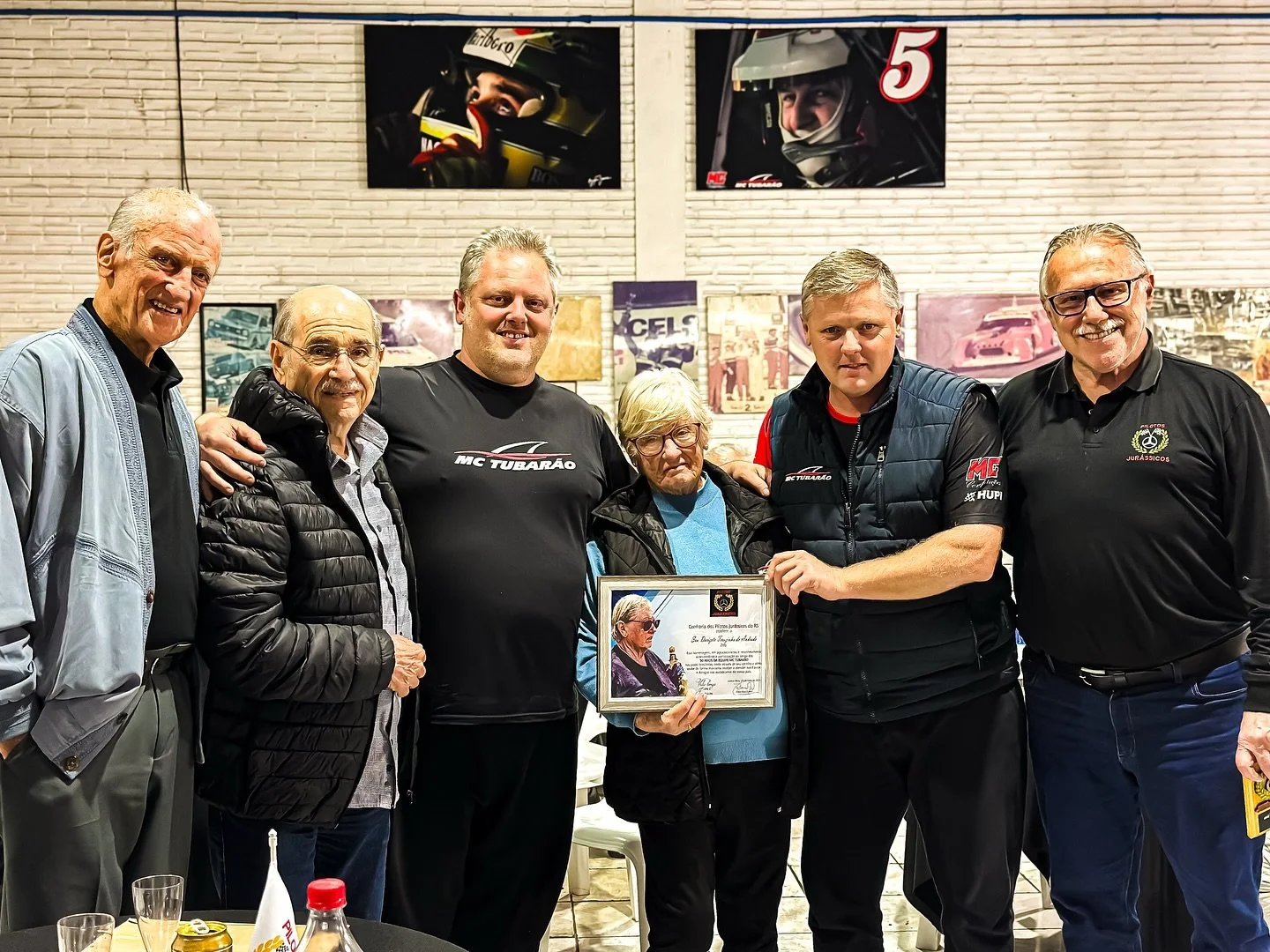 Uma noite marcada por muita emoção e homenagens. Na terça-feira (20), na sede da equipe MC Tubarão, em Campo Bom (RS), os Pilotos Jurássicos realizaram uma linda homenagem à matriarca da família Andrade durante a tradicional confraria do grupo de ex-pilotos e preparadores de carros. Dorizete Terezinha de Andrade, a dona Zeti, viúva do fundador da MC Tubarão, Carlinhos de Andrade (in memoriam – falecido em 2019), foi homenageada com enorme carinho, tendo recebido um quadro com sua foto. A equipe ainda recebeu o reconhecimento pelos 50 anos de história completados em 2025.